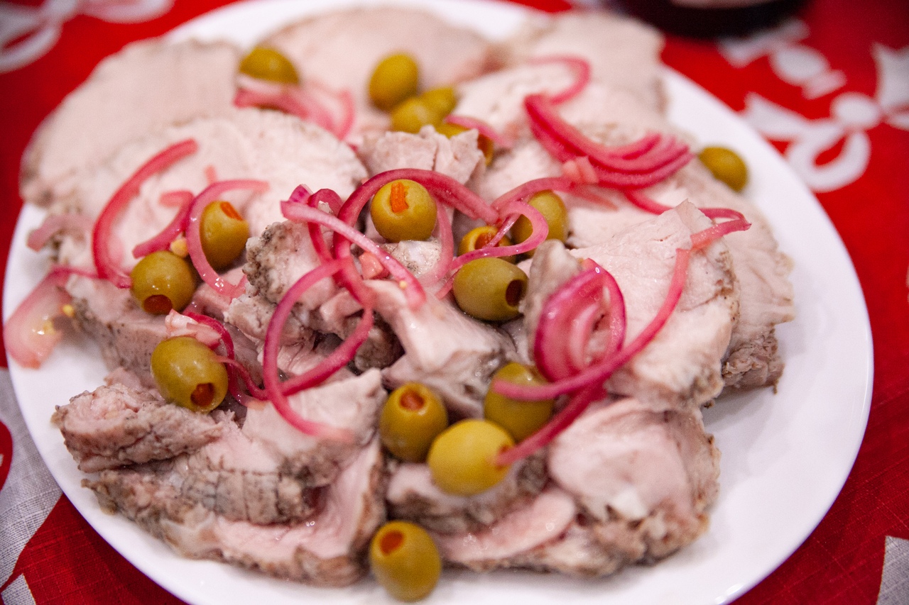 3. Свинина су-вид, подана с оливками и маринованным луком